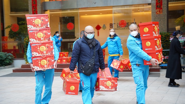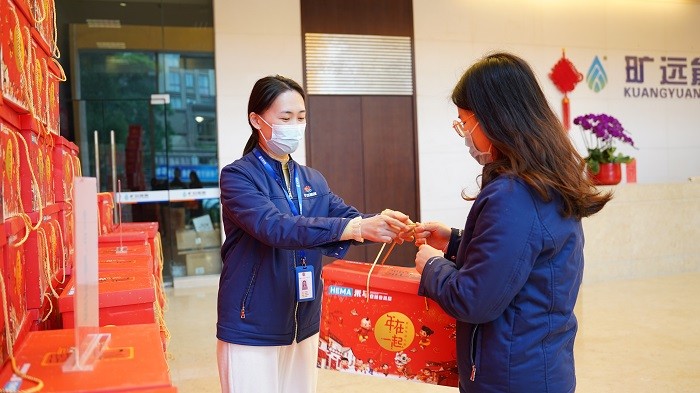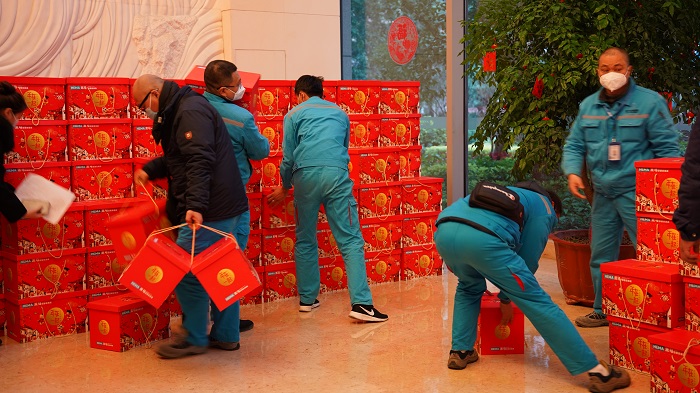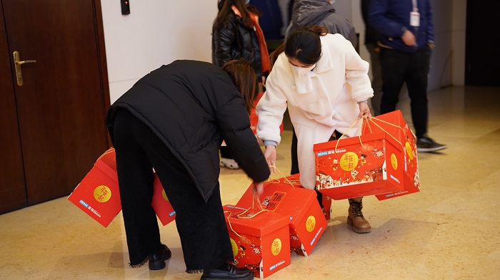ÔÚËùÓÐÄê»õµ½Î»Ö®ºó£¬¸÷¹«Ë¾Ô±¹¤À´µ½Ò»Â¥´óÌü£¬Âú»³¼¤¶¯µÄÐÄÇéÁìÈ¡Äê»õ¡£¡°¿ì¿ì¿ì£¬µãһϡ£¡±¡°Äã×ÊÖú¶àÄü¸¸ö£¬Ò»ÆðÉÏÈ¥£¡¡±¡°Õâ¸ö²»´í£¬ÎÒϲ»¶³Ô¡£¡±Äê»õ·¢·ÅÏÖ³¡Æø·ÕÈÈÁÒ£¬¸÷ÈËÌá×ųÁµéµéµÄÄê»õ£¬Á³ÉÏÑóÒç×ÅЦÈÝ£¬Ð´º¼Ñ½ÚµÄϲÔÃÒÑÝÓÈÆÔÚ¹«Ë¾ÄÚÍâ¡£